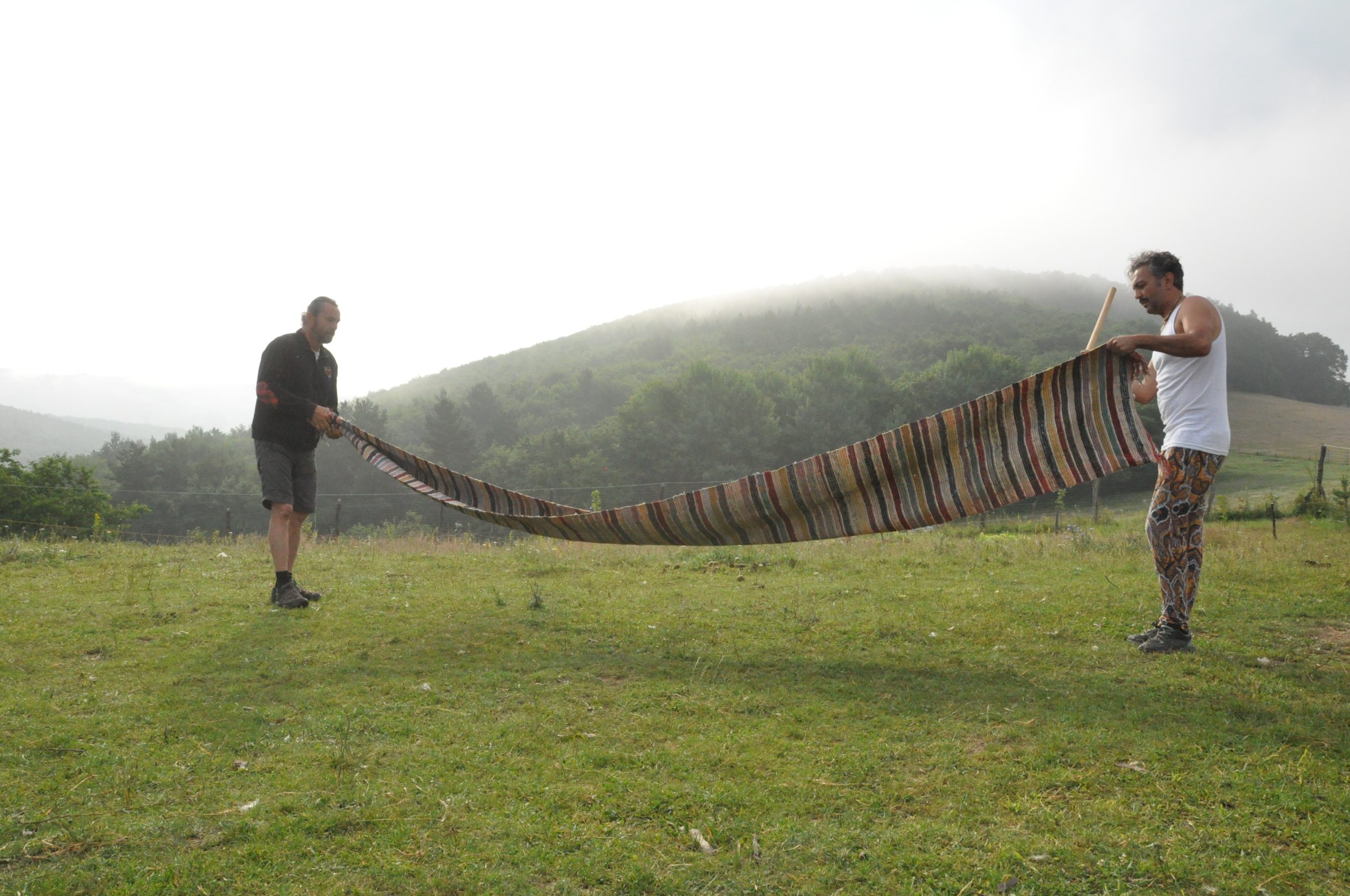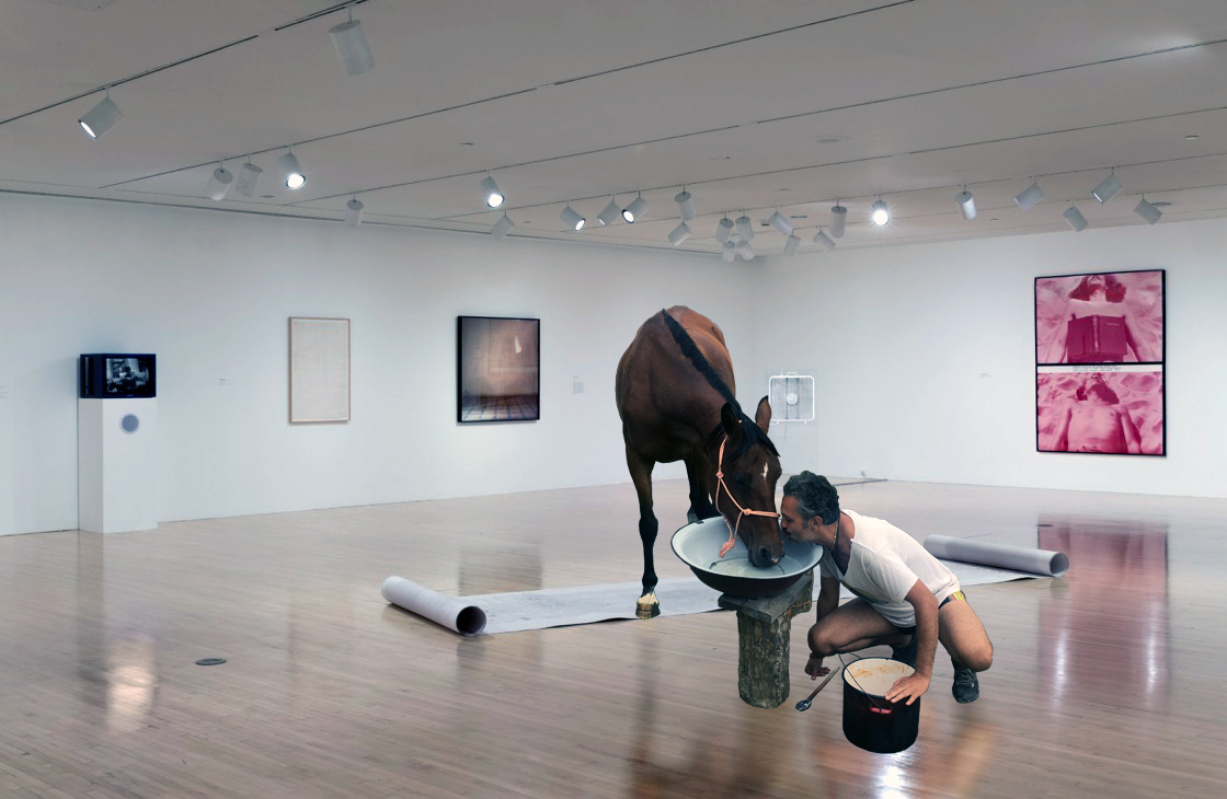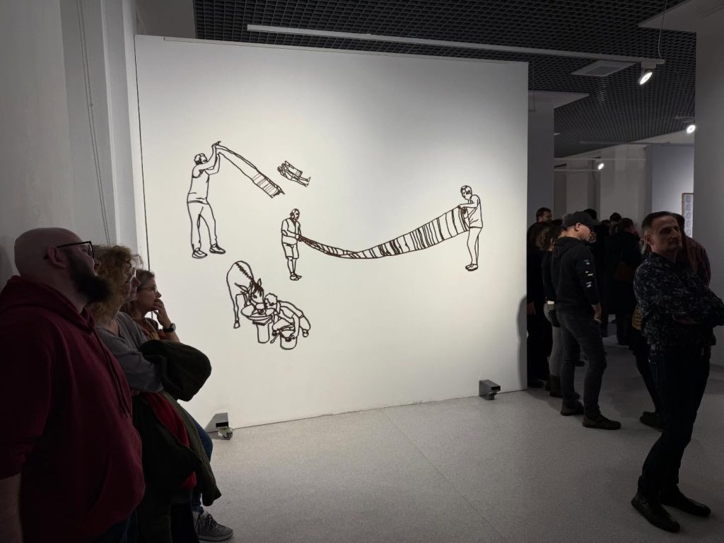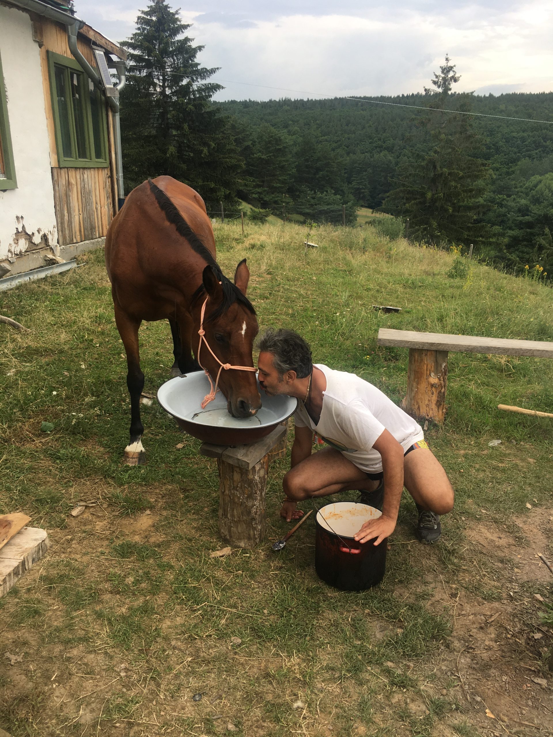 Egy visszavadítós tábori képből indultam ki. A mosogatáshoz készülő duónkhoz battyogott oda egyik hazai ló, majd lassan inni kezdte a még tiszta vízünket. Váratlanul ért mindkettőnket, a pillanat hihetetlenül szép volt, feleszméltem és gyorsan odaszóltam Zsoltnak: igyál te is! Szerencsémre kézügyben volt a gép. Kivágtam a hátteret, belenagyítottam a portrékba, tetszett a mesternek. Javasolta, hogy legyen belőle vonalplasztika verza is, megpróbáltam, működni látszott, anyagot, kivitelezőt kerestem hozzá. A mérete nem óriási, de a tiszta víz témára tökéletesen passzol, azt hiszem. El tudom képzelni egy triptichon első darabjaként. Szerettem dolgozni vele.